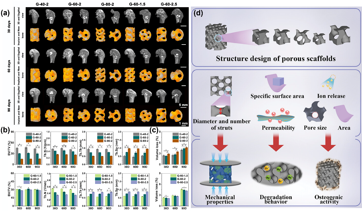 研究人员通过在锌中加入2%的镁制备了Zn-2Mg合金粉末,采用激光粉末床熔融和三周期极小曲面方法,设计并制备了具有不同孔隙率(40%、60%和80%)和单元尺寸(1.5、2和2.5mm)的Zn-2Mg合金多孔支架,结合体外和动物试验分析了合金化和孔隙单元对支架性能的影响(图1)。加入生物活性更优且有促成骨能力的镁后,Zn-2Mg支架表现出优异的生物相容性和成骨能力。承载强度随孔隙率和单元尺寸的增加而降低,降解失重随孔隙率增加和单元尺寸减小而增加。具有较低的孔隙率和较小的单元尺寸的支架能提供合适的孔径和表面积,因此具有更强的成骨能力。研究结果表明,3D打印锌合金多孔支架能够充分发挥材料结构功能一体化优势,有望满足骨缺损修复的个性化需求,提升骨修复疗效。相关成果以“具有可定制降解行为和优良促成骨能力的Zn-2Mg合金多孔支架”(Additively manufactured Zn‐2Mg alloy porous scaffolds with customizable biodegradable performance and enhanced osteogenic ability)(论文1)发表于《先进科学》(Advanced Science)期刊。
