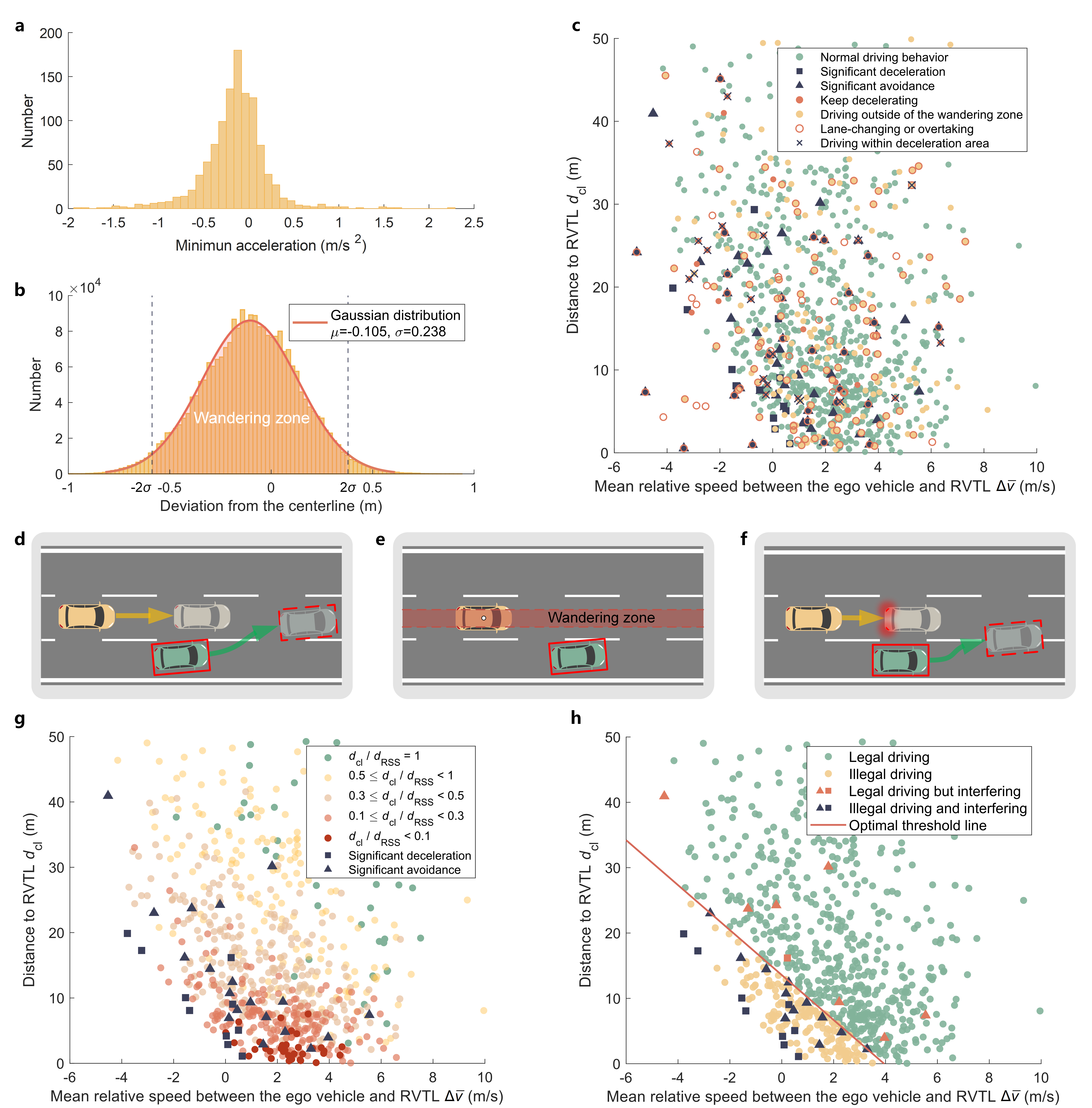 研究团队基于可用数据集,依据各交通法规条例涉及的约束、阈值及监测类型选取了高速路与十字路典型条例为例,分析了包括“不得骑、轧车行道分界线或者在路肩上行驶”“变更车道的机动车不得影响相关车道内行驶的机动车的正常行驶”和“转弯的车辆不得妨碍被放行的直行车辆、行人通行”等涉及模糊阈值的条例,确定了包括最大允许压线时间、换道时与前车的最小TTC(Time To Collision)、换道时与目标车道后车的最小允许距离和左转与直行车辆冲突时最小允许时间差等合规性阈值。