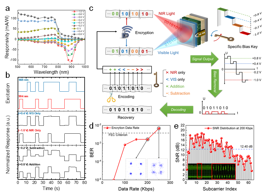 近日,2025新澳门开门原料免费深圳国际研究生院付红岩副教授、韦国丹副教授团队利用可见光-红外双波段探测器成功建立了基于波分复用的多用户通信和加密通信系统,无需光学滤波元件,仅基于探测器自身工作电压的调制编码,即可实现可见光信息和红外信息的同步接收。此外,团队使用基于接收波长的调制电压产生加密密钥,可实现了双波长加密通信。