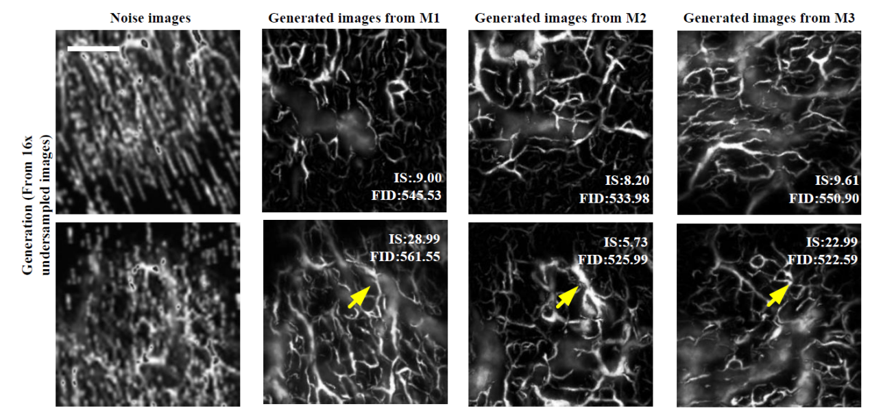 图3.借助噪音图像生成血管造影图像的举例。图中噪音图像Noise images输入不同的生成模型M1,M2以及M3,生成不同的血管造影图像
