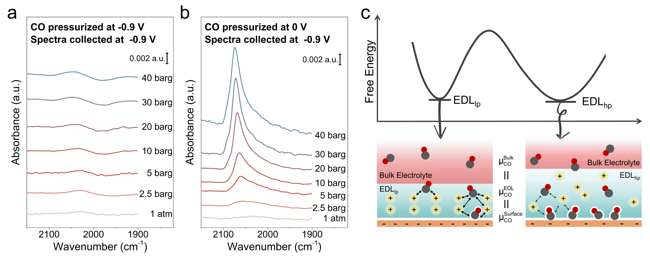 图1.施加电位和提升压力顺序的不同形成两种不同电化学界面。(a)在-0.9V条件加压时,COL峰随CO压力的变化;(b)在0 V条件加压时,COL峰随CO压力的变化;(c)两种电化学界面的模型示意图