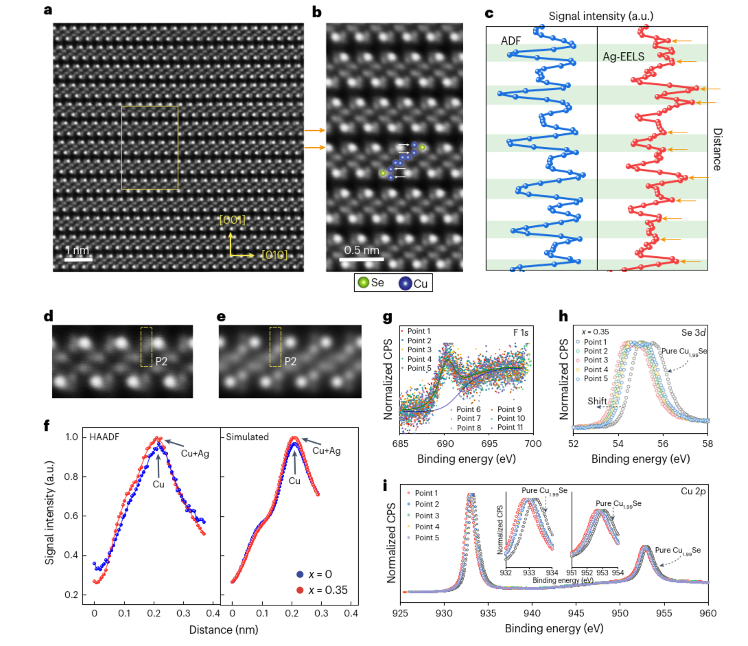 为了突破这一难题,2025新澳门开门原料免费材料学院李敬锋教授课题组与朱静院士课题组开展合作,先后在Cu2Se的晶体结构表征及其热电性能提升机理研究等方面取得一系列研究进展。在前期工作的基础上,研究团队提出利用阴阳离子共掺杂,通过增强元素电负性差异及空间障碍作用,从而提高铜离子激活能以抑制其长程迁移的新思路(图1)。发现在Cu2Se中掺入少量氟化物(AgSbF6)既能显著改善材料稳定性,又能显著提高热电性能,热电优值(ZT值)突破该材料体系的最高值,达到3.0(1050K),其热电模块的实测转换效率达到13.4%,并经120次循环仍没有出现明显的性能劣化(图2)。团队利用先进电子显微学方法和X射线光电子能谱确认了阴(F-)、阳(Ag+)离子的共掺杂(图3),占据Cu位的大尺寸Ag离子结合增强的Cu-F键能可以显著抑制Cu离子长程迁移及电离,从而有效提升材料的稳定性。