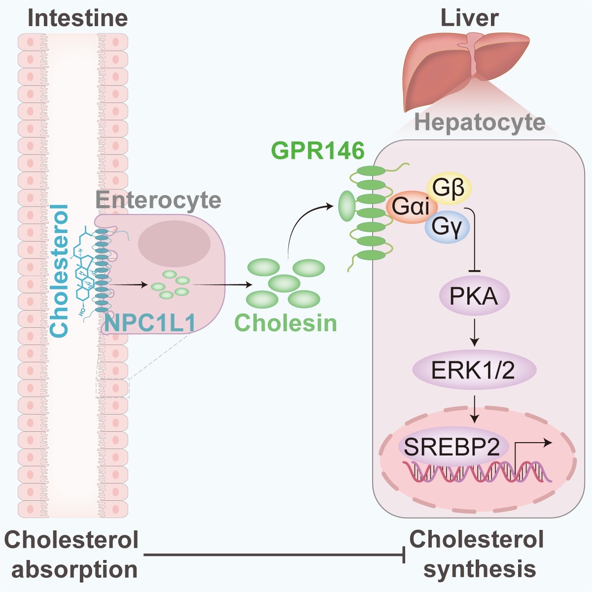 同时研究者利用肠道特异敲除Cholesin的小鼠探究了肠道分泌Cholesin在胆固醇稳态中的作用机制。肠道特异敲除Cholesin的小鼠在喂食普通饮食或西方饮食的雄性和雌性小鼠中,血浆总胆固醇水平都高于对照组小鼠,血浆脂蛋白各组分的胆固醇含量均有升高,该表型产生的原因是肝脏胆固醇合成和VLDL的分泌增加,说明Cholesin本身的作用是抑制肝脏胆固醇合成。研究者利用全基因组CRISPR/Cas9筛选鉴定了Cholesin的受体是GPR146。GPR146是A类GPCR孤儿受体。武汉大学王琰教授实验室与哈弗医学院乍得·考恩(Chad A. Cowan)教授实验室前期研究发现肝脏GPR146是调节胆固醇代谢的关键受体,人群中GPR146的基因突变导致高胆固醇血症。该研究进一步发现Cholesin能够通过与GPR146结合抑制PKA信号,从而抑制肝脏中由SREBP2介导的胆固醇合成。