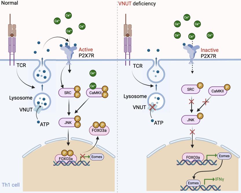 研究成果以“VNUT介导的ATP释放通过P2X7R-JNK-FOXO3a-Eomes信号级联抑制辅助性T细胞(Th)1型分化”(VNUT-mediated ATP release suppresses T helper (Th) 1 cell differentiation via the P2X7R-JNK-FOXO3a-Eomes signaling cascade)为题,于12月19日发表于《科学进展》(Science Advances)。