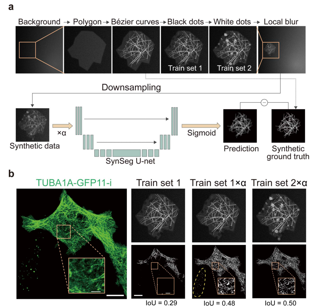 图1.细胞骨架为例分割模型。(a)合成细胞骨架数据集生成与U-Net模型架构。(b)基于Airyscan成像对split-GFP标记的TUBA1A进行细胞骨架分割