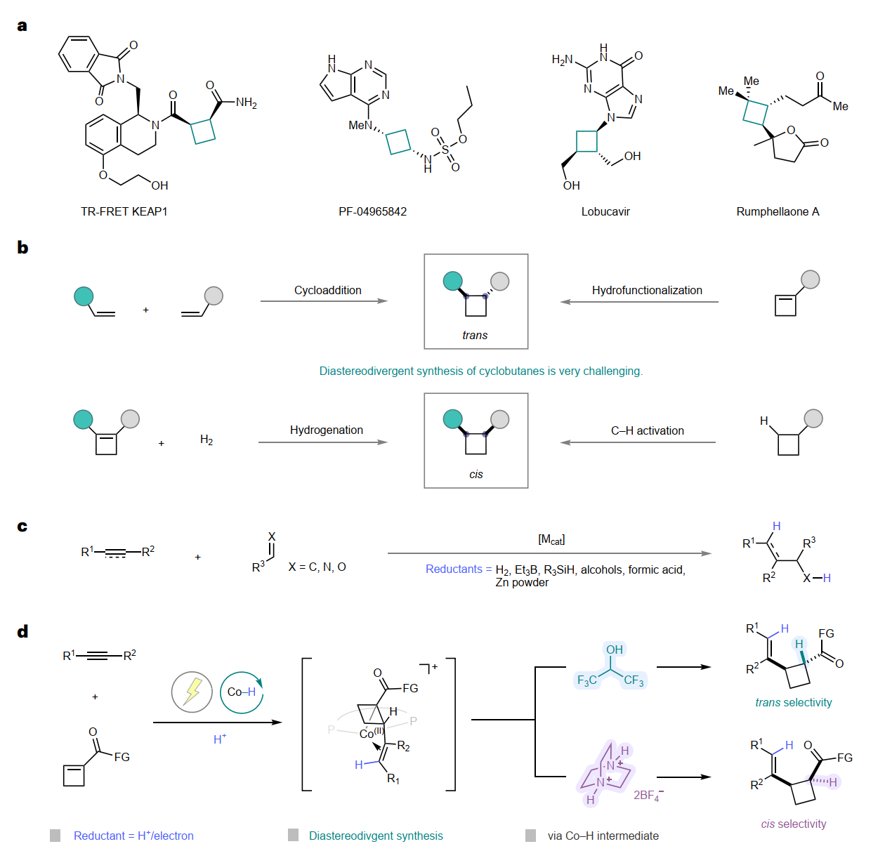 环丁烷结构广泛存在于多种天然产物与药物分子中,其相对构型(顺式cis或反式trans)对生物活性具有重要影响(图a)。然而,传统合成方法往往只能选择性地制备某一种立体异构体,难以实现从同一底物出发高效、可控地合成所有可能的异构体,开发通用性强的立体发散式合成策略仍极具挑战(图b)。