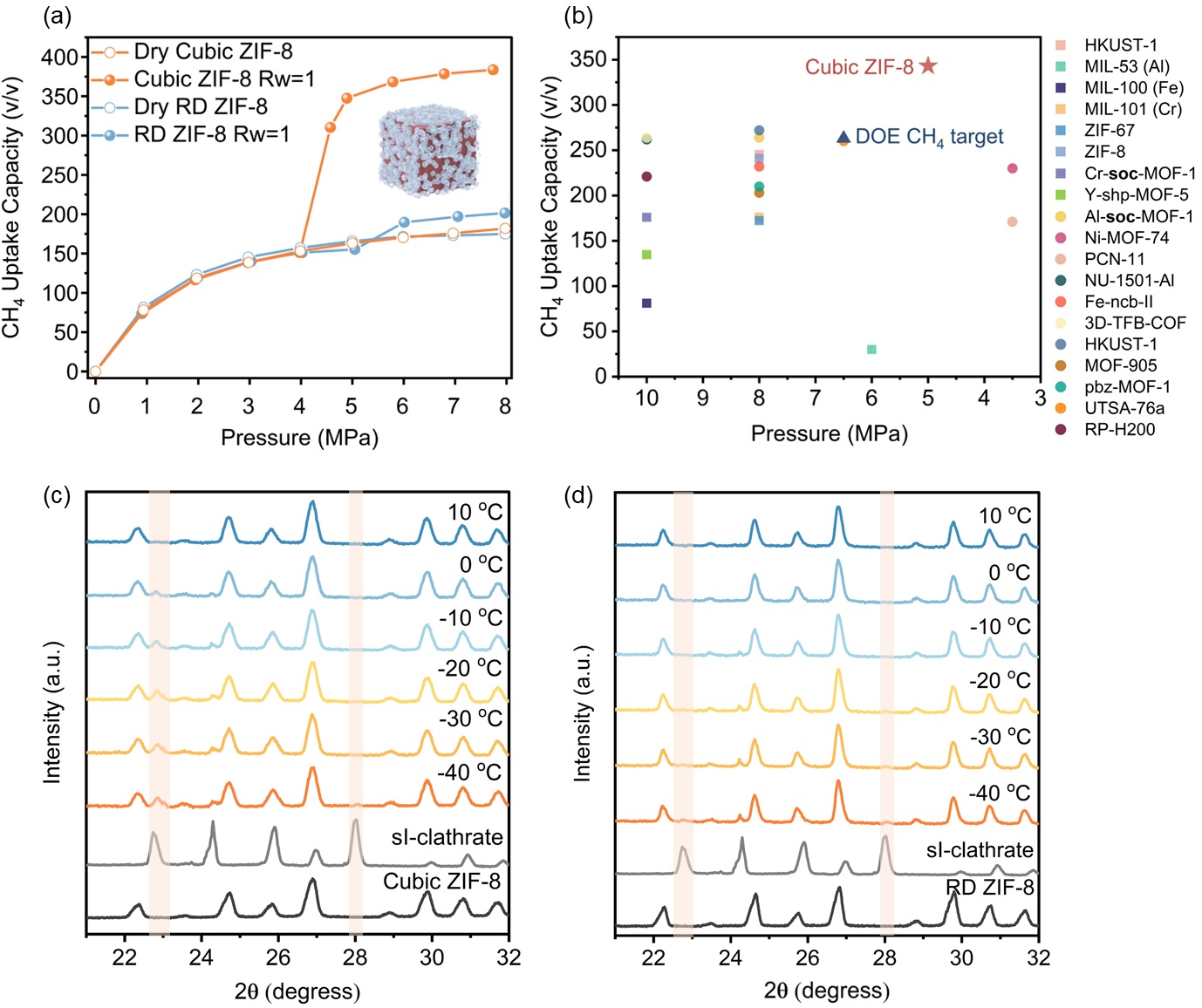 在富水相体系中,Cubic ZIF-8表现出显著的动力学优势。研究发现,Cubic ZIF-8能够有效延缓气液界面水合物膜的形成,从而延长甲烷水合物的高效生成阶段。可视化分析表明,在10wt%的Cubic ZIF-8浆料中,甲烷水合物的有效生成时间延长至84min,较纯水体系提高约75%。在富材料相体系中,预润湿的Cubic ZIF-8展现出优异的甲烷存储性能。在2oC、8 MPa条件下,其甲烷体积存储容量达到383v/v,显著高于预润湿RD ZIF-8对应的228 v/v。同时,在2oC、5MPa条件下,预润湿Cubic ZIF-8可实现343v/v的甲烷体积储存容量,显著超过了DOE对于车载甲烷体积容量存储目标263v/v,同时创下了温和条件下固态甲烷存储的最高纪录。