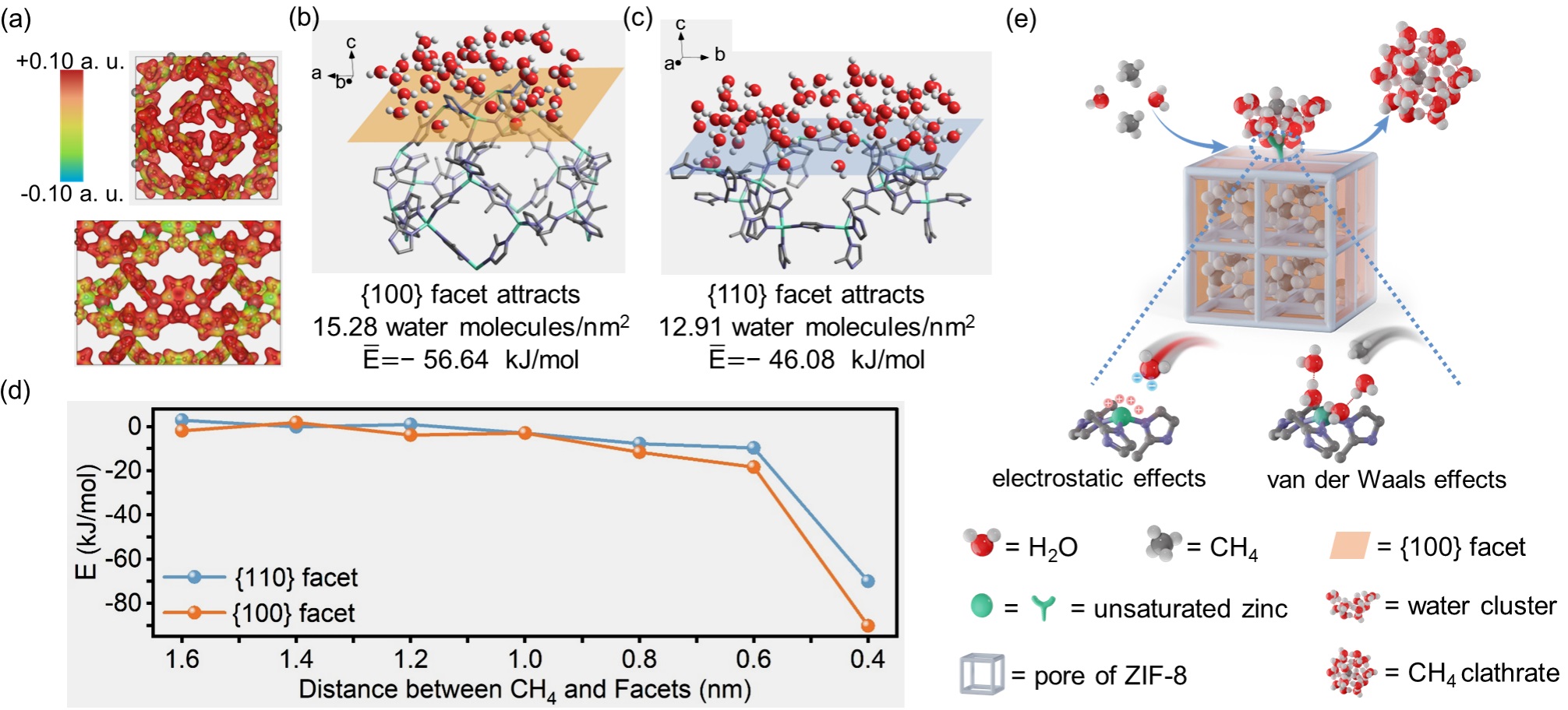 研究发现,Cubic ZIF-8暴露的{100}晶面具有更高密度的未饱和配位Zn2+位点,在材料表面形成更强的正电场,从而诱导极性水分子在晶面上预吸附形成有序的水分子簇。这些预组装的有序水簇显著地促进了甲烷分子的液相运移,帮助甲烷水合物在{100}晶面上生长,实现了甲烷物理吸附与水合物生成的高效协同。DFT理论计算与原位高压拉曼光谱DE结果进一步证实了晶面依赖的水分子预吸附行为及其在吸附-水合固态甲烷存储过程中的关键作用。