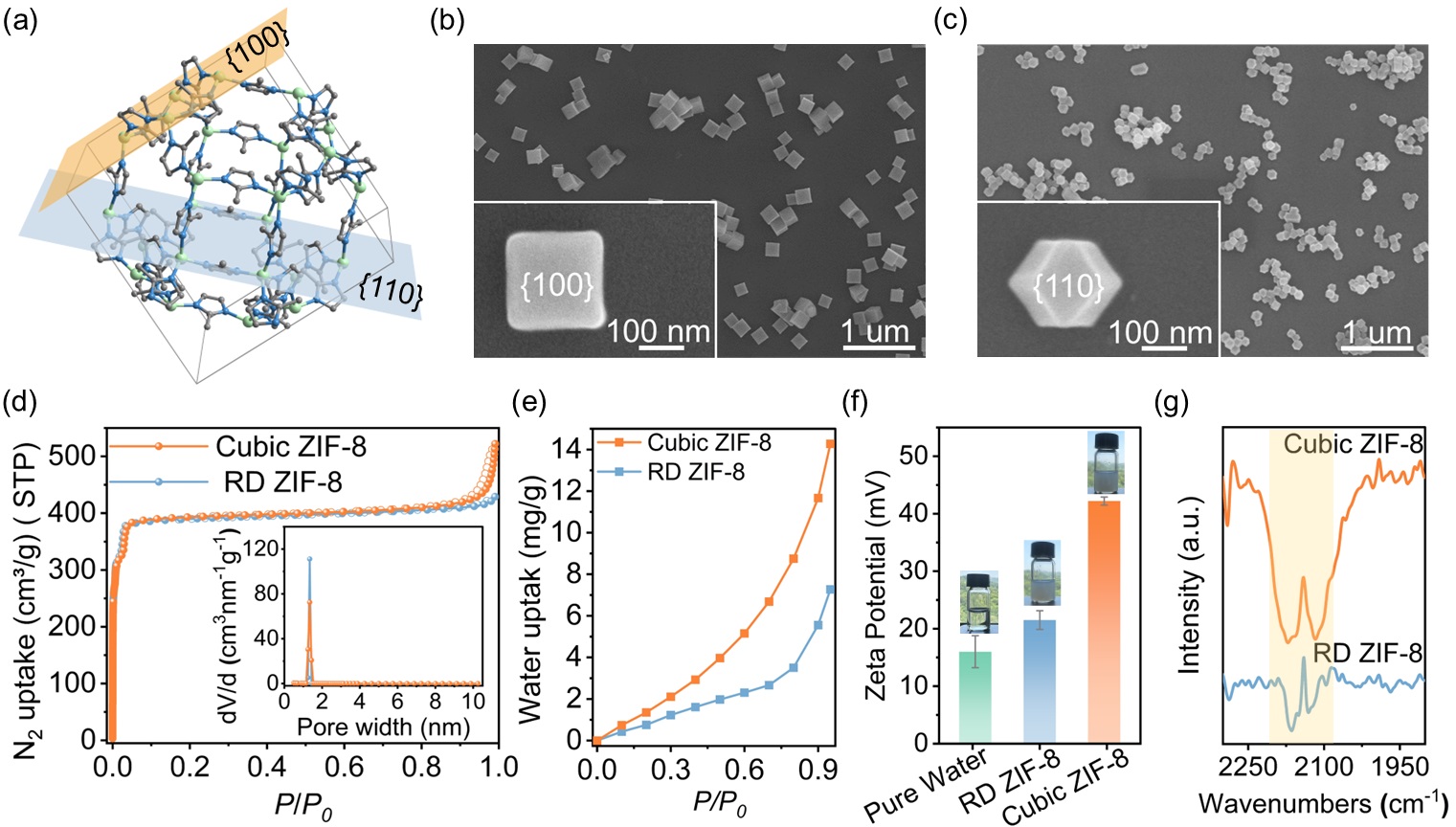 研究团队通过精确调控MOF的暴露晶面,改变ZIF-8表面不饱和金属位点的分布密度,从而实现对界面水分子结构的定向调控,促进甲烷水合物的成核与生长,并显著提升甲烷的固态存储性能。研究团队ZIF-8为研究对象,成功制备了暴露{100}晶面的立方ZIF-8(Cubic ZIF-8),并以暴露{110}晶面的菱形十二面体ZIF-8(RD ZIF-8)作为对照体系。