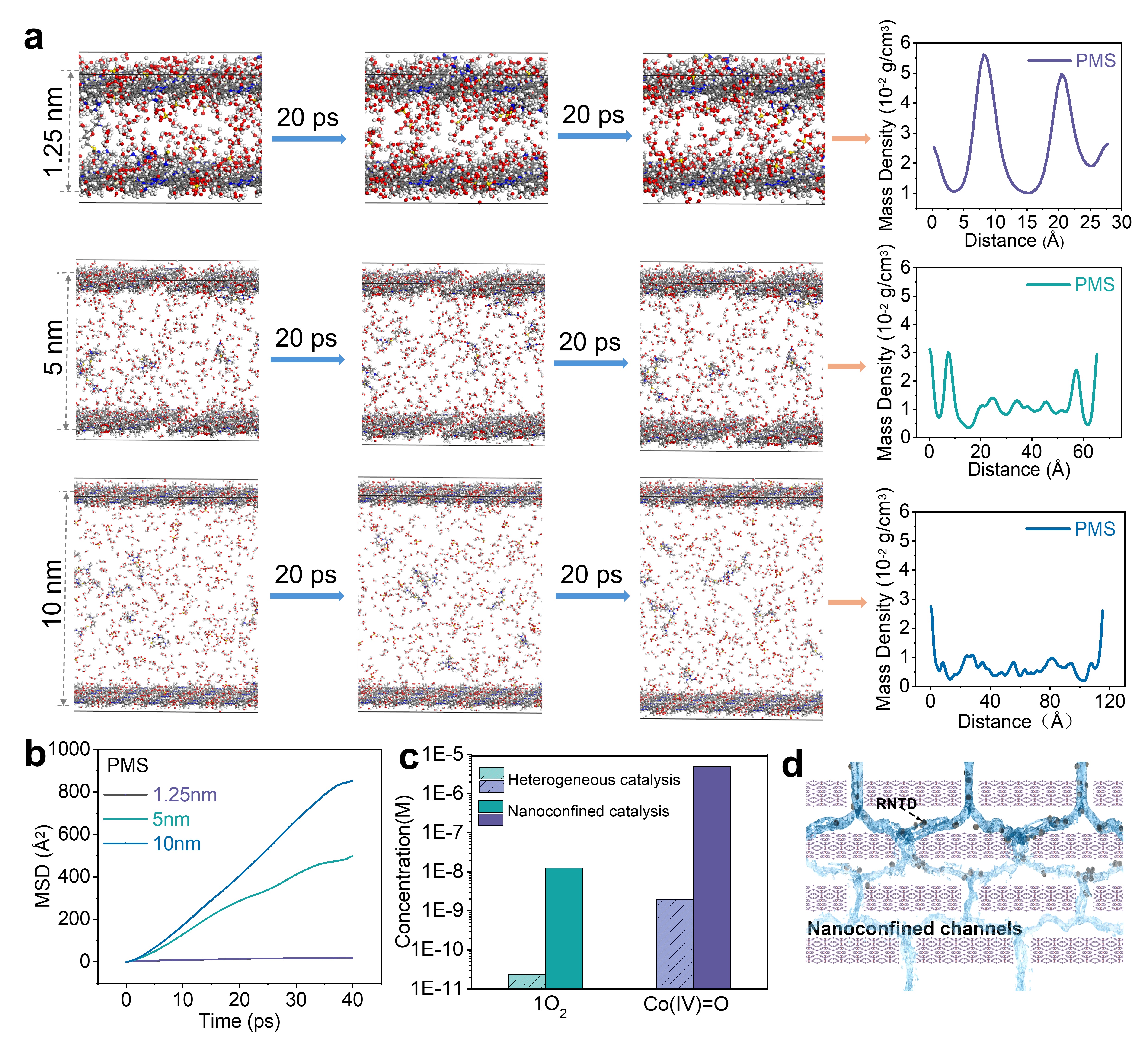 这一Ce-Co TCPP膜在降解有机污染物方面展现出极高的反应活性,同时实现了高水通量和长期稳定运行。研究团队通过密度泛函理论(DFT)计算表明,PMS活化体系中增强的电子离域和双电子转移途径,显著降低了反应能垒,促进了低能中间体的生成与Co(IV)=O的高效累积。研究团队通过进一步基于分子动力学(MD)模拟发现,层状膜内部二维纳米限域通道可使活性物种与底物发生约1000倍富集效应,并显著缩短传质路径、提升碰撞频率,从而实现污染物的加速氧化降解和体系整体催化性能提升。