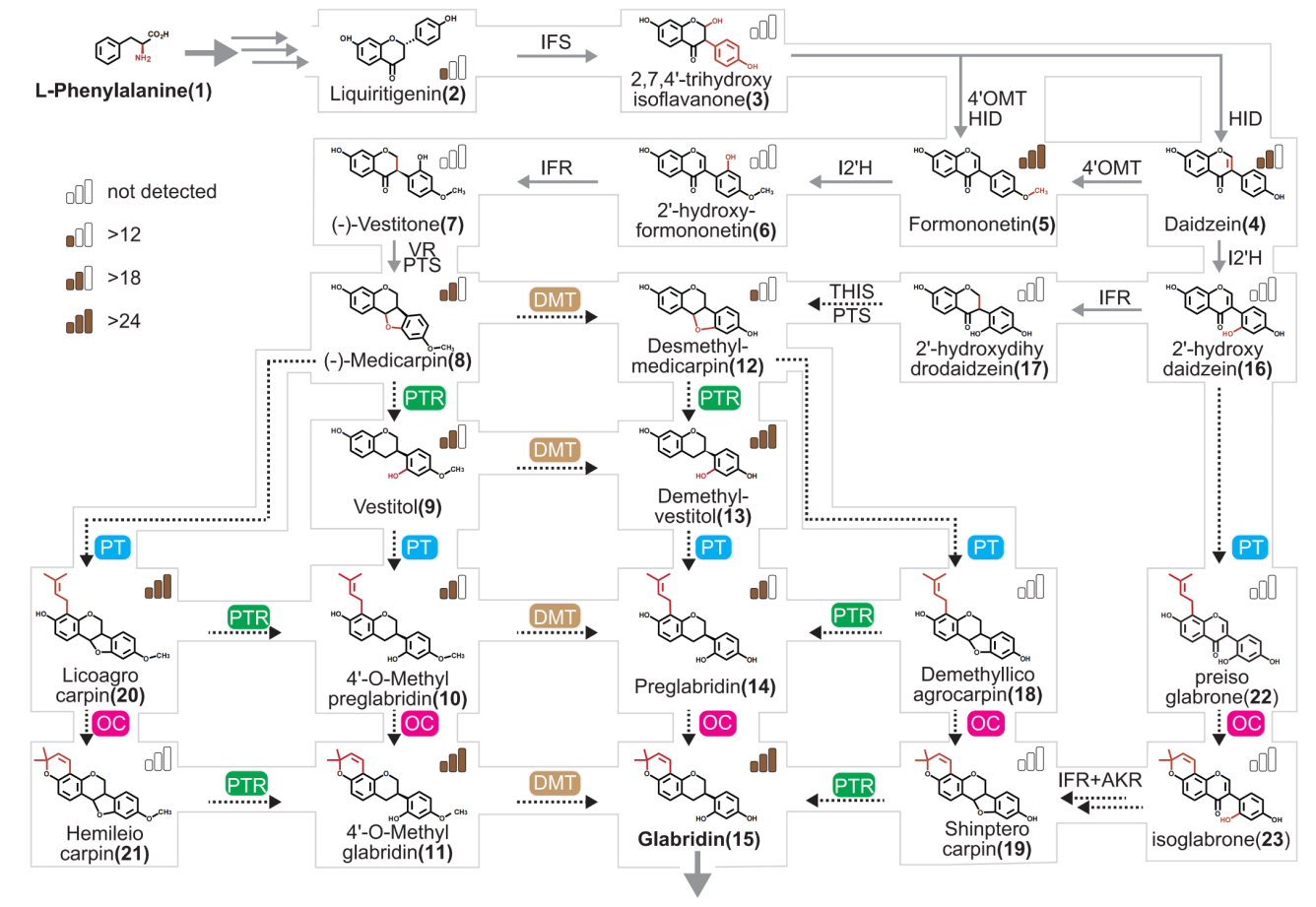 自2018年,课题组成员前往新疆、甘肃的7个地区,在不同季节采集光果甘草、胀果甘草、乌拉尔甘草资源,对其进行了详细的基因组、转录组、代谢组分析,构建出完善的甘草基因组数据库。结合染色体级甘草基因组组装与183个野生甘草转录组数据,构建了基于酶反应规则的代谢路径搜索算法,识别出13条可能的合成路线,涵盖21种关键中间代谢物。结合代谢组验证与功能筛选,发现了4类具异黄烷修饰活性的关键酶,包括紫檀素还原酶(pterocarpin reductase)、异戊烯基转移酶(prenyltransferase)、氧化环化酶(oxidative cyclase)和O-去甲基酶(demethylase)。这些酶通过“保护-去保护”修饰逻辑,形成了一个多分支、互联互通的“梯形”修饰网络,揭示了此前未被认识的多路径合成网络。该发现挑战了线性合成途径的传统认知,显著提升了代谢路径的鲁棒性与产物收率。通过物种间的比较,解析了光甘草定只在光果甘草中高效合成的遗传机制与物种间异黄酮合成途径的进化差异。