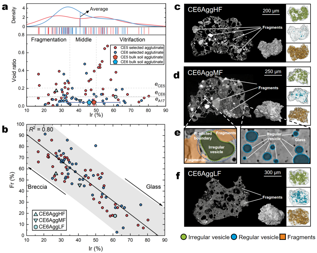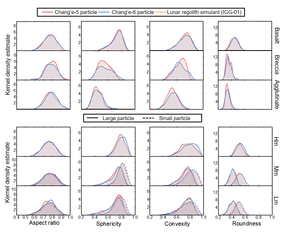 为此,研究团队采用了高分辨率微米级X射线显微CT技术,并结合机器学习图像分割与识别方法,对嫦娥五号与嫦娥六号返回的月壤粉末样进行了三维定量分析,系统获取了数万枚玄武岩、角砾岩、胶结物及单一矿物相颗粒的三维轮廓形态和内部孔隙结构数据。进而将这些形态学数据与地球物理和地球化学分析相结合,可实现对月壤样品更为全面和精确的综合溯源。基于这些数据,本研究回答了月球样品工程物性研究领域的一个关键科学问题,即在月球正、背面地质年龄与太空风化程度均存在显著差异的嫦娥五号、六号采样区,月壤颗粒的形态特征是否会因其经历的月表过程不同而产生明显差异。