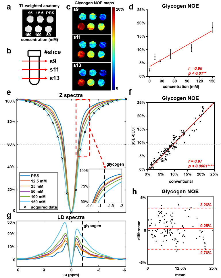 图2.使用1%琼脂的糖原仿体对SSE-CEST进行定量评估