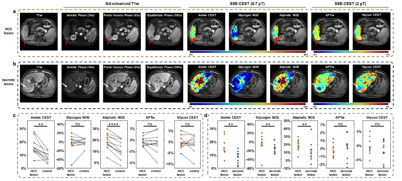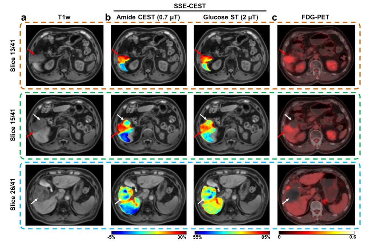 研究利用糖原仿体与离体猪肝验证对比SSE-CEST与传统CEST,评估不同z-ω采样轨迹(平行、钻石、放射)的保真度;同时选择了20名健康志愿者完成重复扫描验证可重复性,评估多代谢物变化和动态监测葡萄糖代谢。另外纳入12例肝细胞癌(HCC)患者比较活性病灶与治疗后坏死病灶,并与FDG-PET/CT及常规增强MRI对比。
