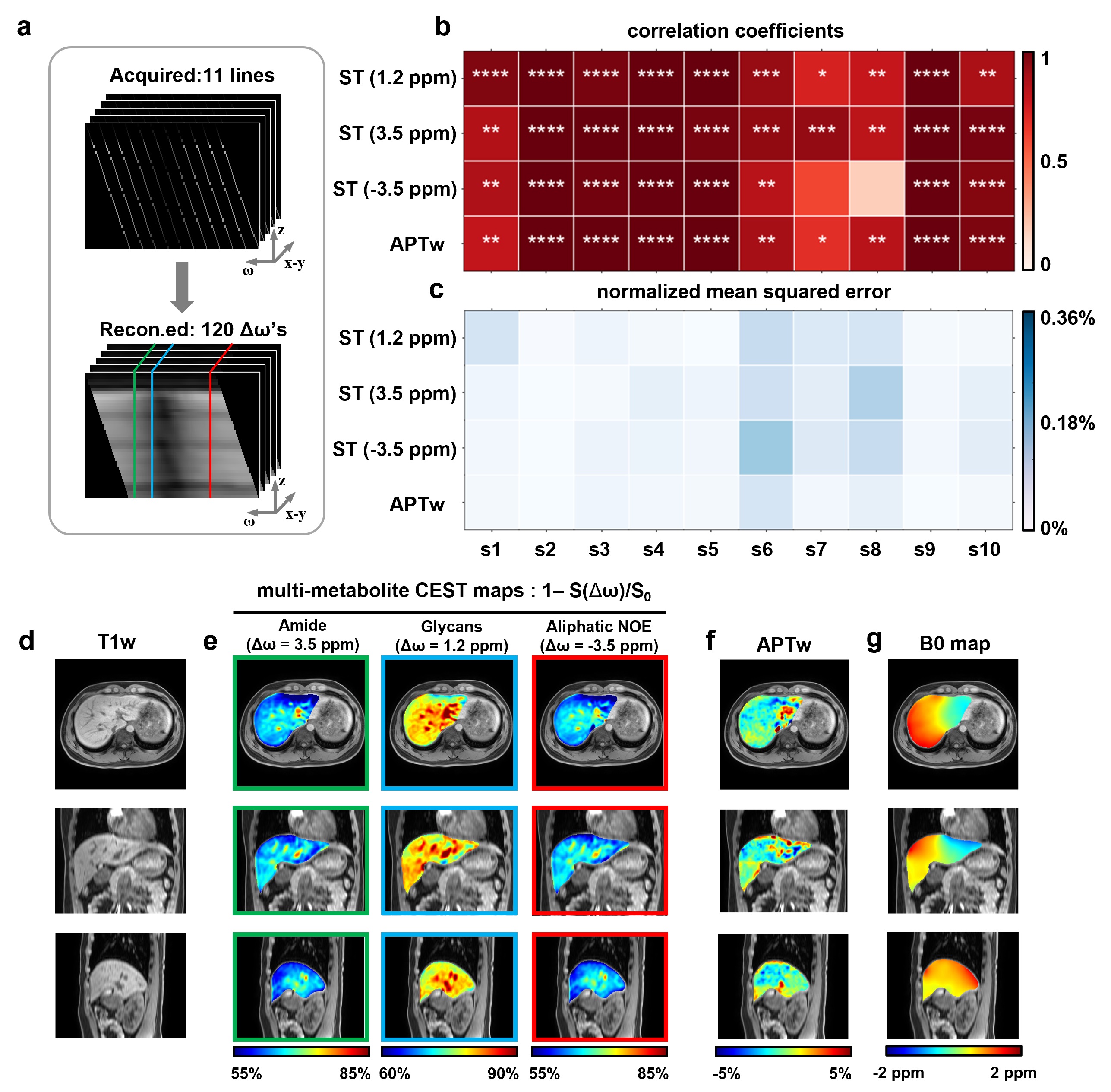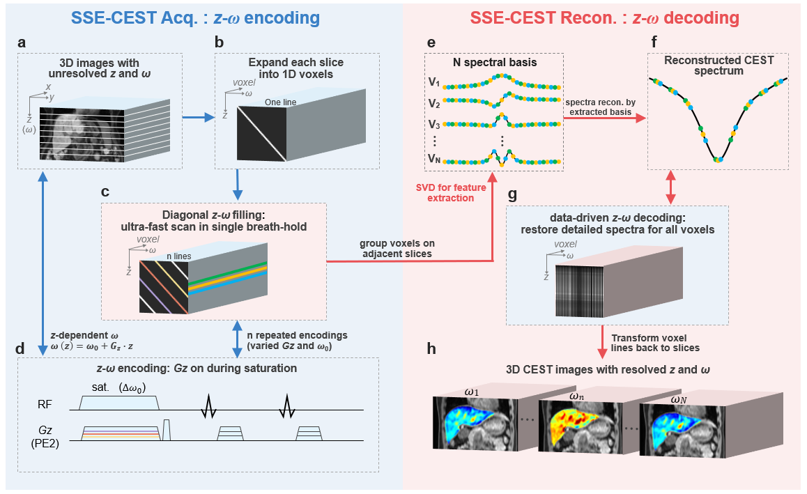 该研究提出了一种空间-频谱编码(SSE)CEST-MRI方法(图1),成功实现了超快z-ω编码采集、数据驱动频谱重建和单次屏气采集。