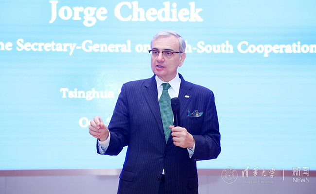 联合国秘书长南南合作特使霍尔赫·切蒂科(Jorge Chediek)就南南合作的发展历程和未来趋势为主题,为同学们带来了精彩演讲。他介绍了南南合作的历史背景和发展历程,并指出中国在世界发展过程中发挥的重要作用。在与同学们的互动环节中,切蒂科解释了联合国的运行机制,并激励青年人为实现全人类的共同发展而努力奋斗。