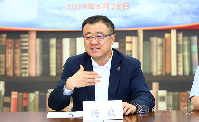 杨斌代表学校向学员代表授剑,并对学员们提出了殷切希望,希望学员们秉承“自强不息”的清华精神,保持军人品质,保有持久并付诸行动的成就期望,走长路、拼后劲,出色的完成学业和军政素质训练。他希望同学们始终充满自信,勇于面对未来的挑战,迎接挫折和磨难,早日成长为祖国的栋梁。同时,他也提醒同学们要认识到学校的发展、国家形势的变化,以及国际格局的变革,敏锐的发现技术领域发生的革命性变化以及其对军事斗争可能产生的重要影响,以拥抱变化、引领变化的态度面对以后的学习与工作。他表示,学校将会持续关心大家的成长和发展,希望未来同学们在保家卫国的实践中将星闪耀。