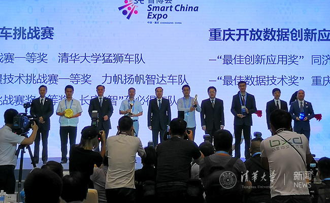 在中国国际智能产业博览会闭幕式中,重庆市委副书记、市长唐良智同志为清华汽车系车队颁发了冠军奖杯,并给予了高度评价。