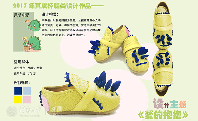 褚洪静在设计作品以“爱的抱抱”为主题,从孩童的童心入手,体现童真、可爱、温馨的感觉,营造幸福美好的氛围,将“爱“的主题体现在设计之上。鞋子的造型设计选取软萌可爱的动物形象,色彩以2017-2018年流行色——绿色系为主,用色俏皮,款式活泼,凸显朝气。造型灵感来源于小恐龙,在童鞋设计中以仿生形态的手法,归纳小恐龙的造型、色彩、表情等特点,探索童鞋设计上新的创新视角。此款设计最终获得童鞋金奖。