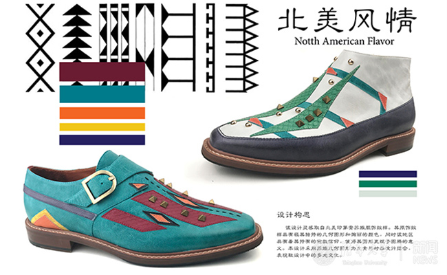 张麦琪的设计作品灵感来自于北美印第安苏族服饰纹样。其服饰纹样具有极其独特的几何形状和绚丽的色彩,同时该地区特有的宗教信仰使得其图形更具备图腾意味。她的设计采用苏族几何图形为元素与时尚流行款式相结合,表现出多元文化的交融。此款设计最终获得男鞋铜奖。