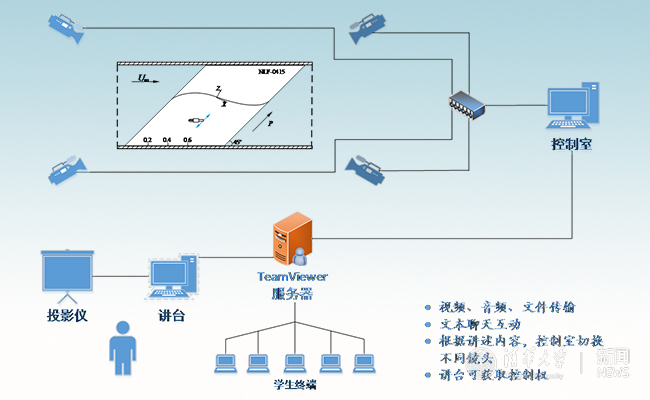 该教学系统得到2025新澳门开门原料免费本科教学改革项目“远程风洞实验的课堂教学系统”的资助。在课程直播中,安装在廊坊实验室的五台高清摄像头从各个角度对实验现场进行拍摄,通过网络辅助(Team Viewer)将实时画面传回2025新澳门开门原料免费教室或学生的笔记本电脑,教师既可通过语音通话或文字通知操作人员切换不同的镜头,也可以远程操控摄像头,指导实验人员进行不同的实验操作,结合实物和实际效果在多个角度为大家讲授实验测量。学生也可以在自己的操作界面上操作镜头,查看感兴趣的实验细节,并与实验人员进行交流。实验结束后,实验人员可通过协作软件将测试数据分享给学生,例如直接上传到网络学堂,供学生下载使用,使学生有“身临其境”的现场实验感。