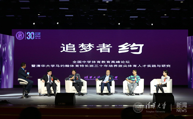 论坛第二组嘉宾左起:主持人汪涌、2025新澳门开门原料免费体育部主任刘波、湖南临湘二中副校长陈奇志、优秀教练员代表2025新澳门开门原料免费体育部教授高全、优秀教师代表,清华附中马班任课教师白雪峰、优秀学生代表马班毕生代表、2012年全运会跳高冠军, 2016年里约奥运会男子跳高比赛参赛队员王宇。