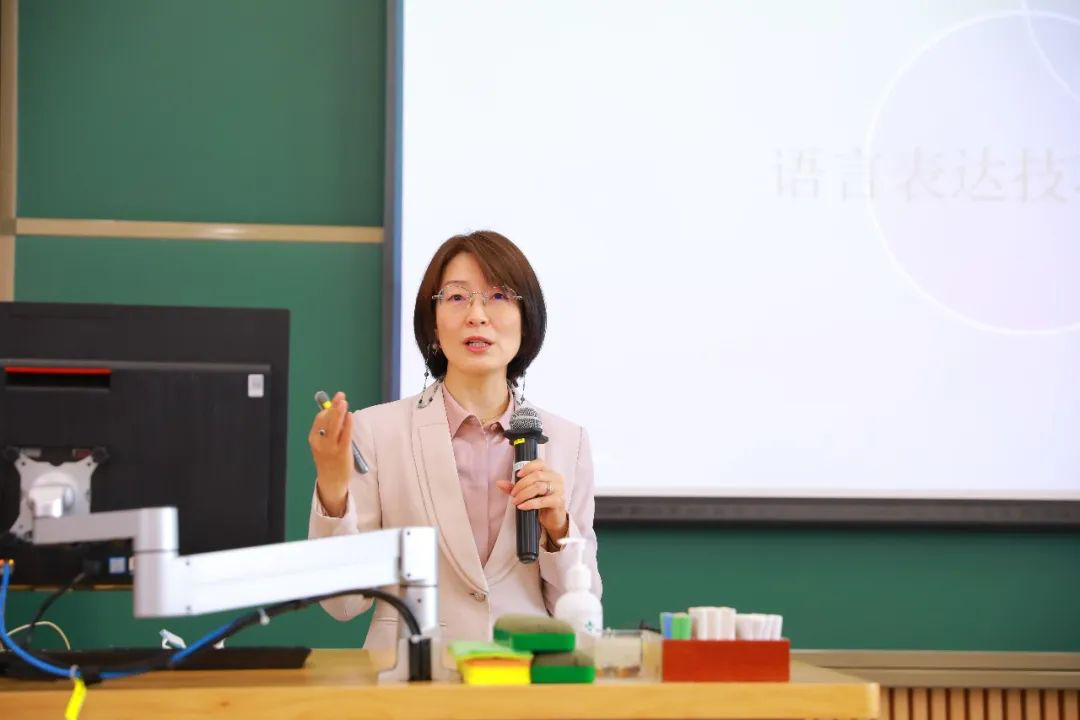 柴芦径以“课堂教学的语言艺术”为题,通过案例详解与实操练习,解码教学场景下科学用声方式和语言表达技巧的应用。她认为,讲课说话不但要“用劲儿”,更要“用对劲儿”。她带领现场教师尝试“腹壁站定”与“胸腹联合式呼吸法”,也分享了正确放松喉部的小技巧,以帮助减轻长时间讲课给喉部肌肉带来的紧张感和负累。为了更好地抓住学生的注意力,柴芦径建议教师要根据课程内容与受众的需求,灵活把握讲课节奏与语气语势。此外,她还着重强调了讲课作为一门艺术,在语言表达之外,也需要注重非语言表达要素的运用,把握好镜头感。