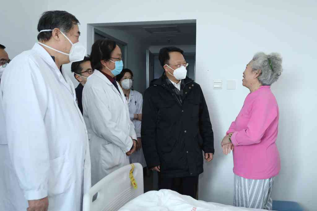 “感谢大家,你们辛苦了!”在华信医院,王希勤、黄天荫一行先后走访了医院门诊、急诊科、老年医学科,听取了医院关于近期患者救治工作的情况汇报,向坚持奋战在一线的医护人员表达感谢并送上慰问品。在住院病房,王希勤代表学校向住院治疗的老同志传达了关心与问候。华信医院党委书记类延旭、院长张明奎等陪同走访调研。