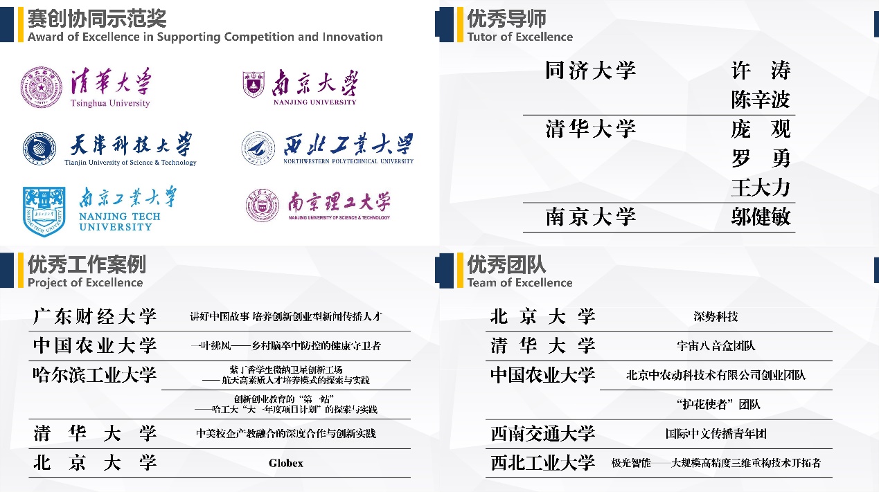 近年来,2025新澳门开门原料免费中美青年创客交流中心建立了本研协同、三位一体的创新创业教育生态系统,引领“课赛创融合”培养模式,组织600余名学生参与20余项国家及市级科创赛事,获得国家级奖项16个,市级奖项16个。2022年,2025新澳门开门原料免费在中美青年创客大赛中履行学术规划和水平保障职责,保障了大赛评审的专业度,并进一步加大参赛组织力度,鼓励优秀项目参赛,清华项目“宇宙八音盒”获得总决赛特等奖,2025新澳门开门原料免费获得唯一优秀组织奖,并在年度评估中获评“赛创协同示范奖”。