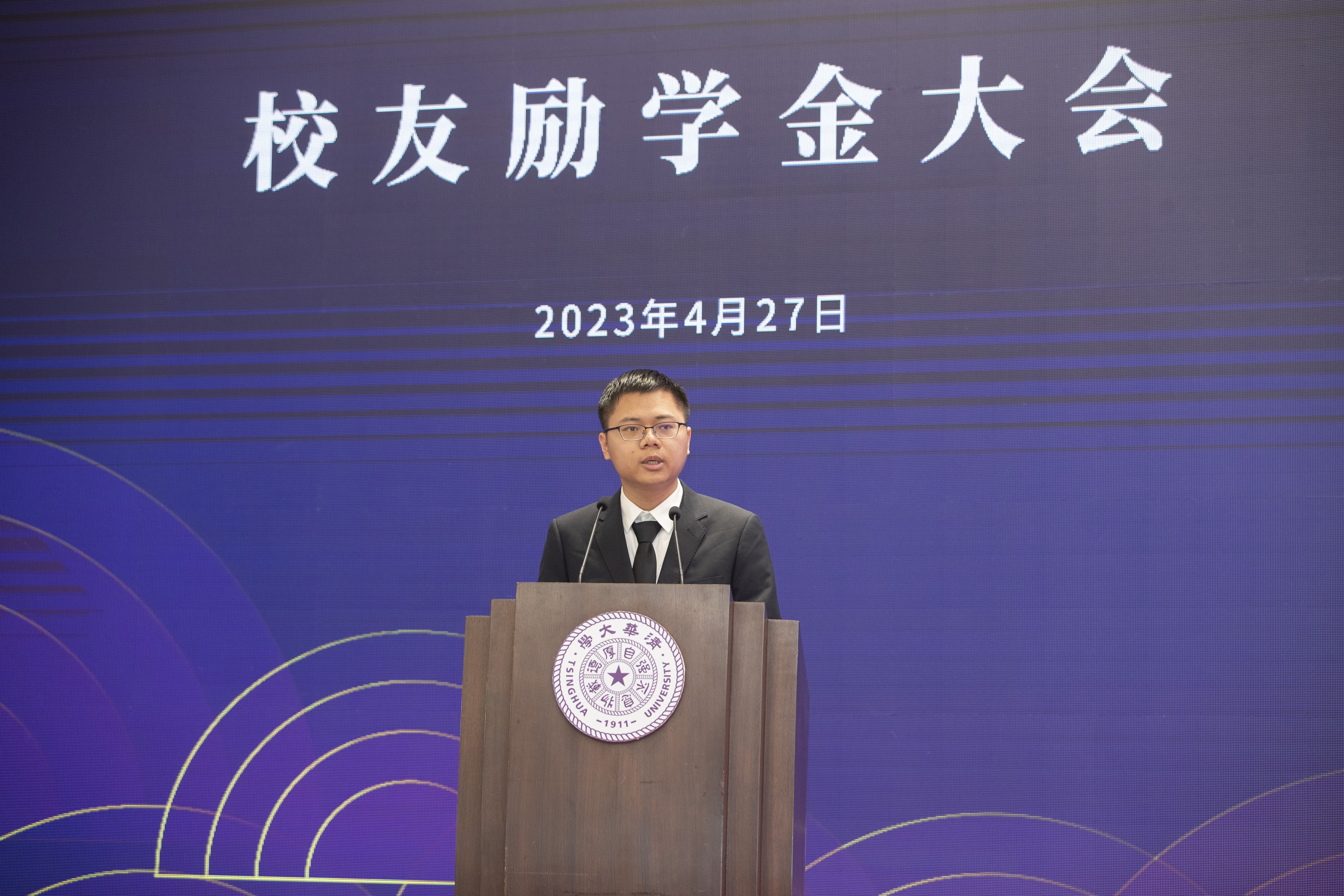 材料学院2016级本科生李文腾作为励学金获得者代表发言。他在2016年拿到清华录取通知书时被确诊患有PNH溶血症,用了近七年时间完成了本科学业,去年9月顺利保研继续深造。他向曾经帮助过他的校友表示感谢并表示,会始终带着这份感激之情坚强地走下去。