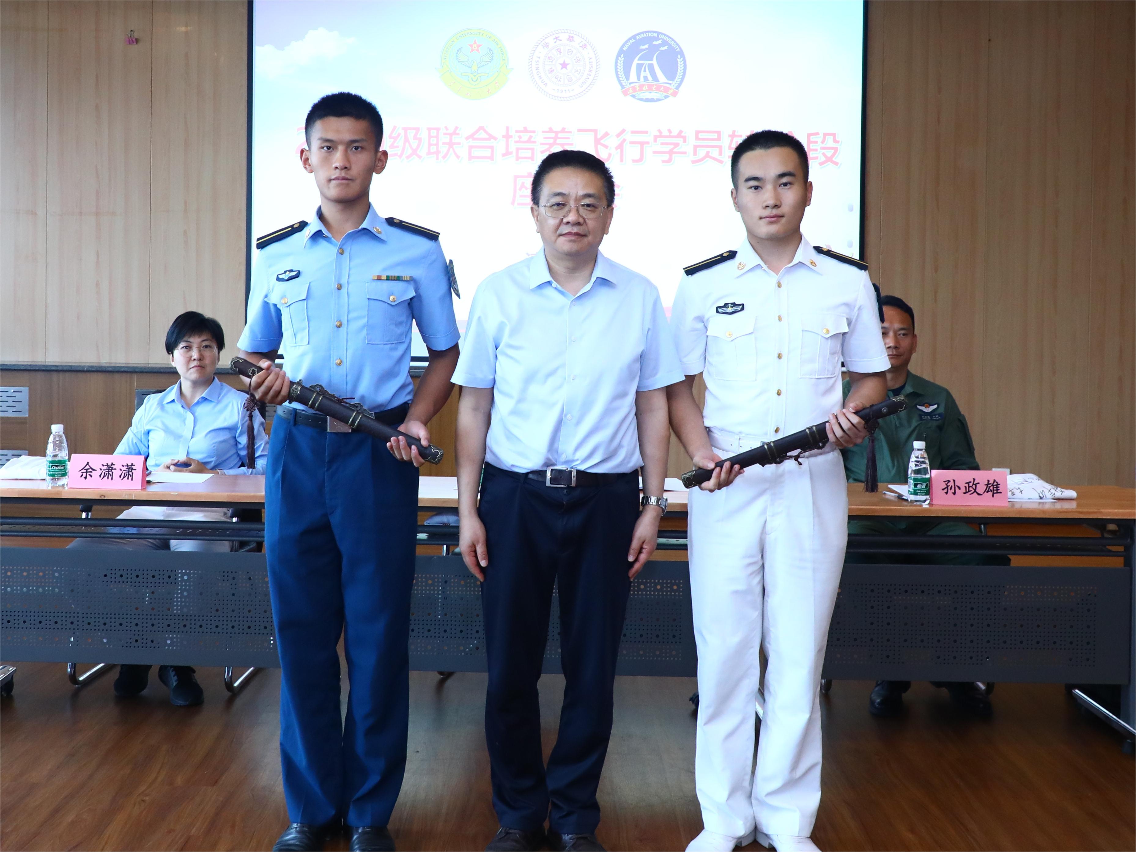 座谈会的最后,航05班向领导老师们赠送了班级签名纪念衫。彭刚向学员代表授剑,希望学员们早日鹰击长空、亮剑海天!