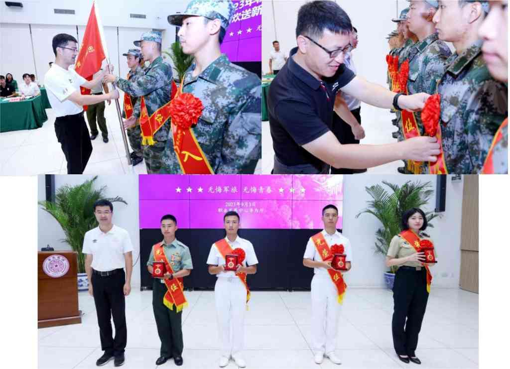 最后,过勇为入伍新兵授旗并向退伍老兵代表颁发清华士兵纪念章,院系教师代表为入伍新兵佩戴大红花。