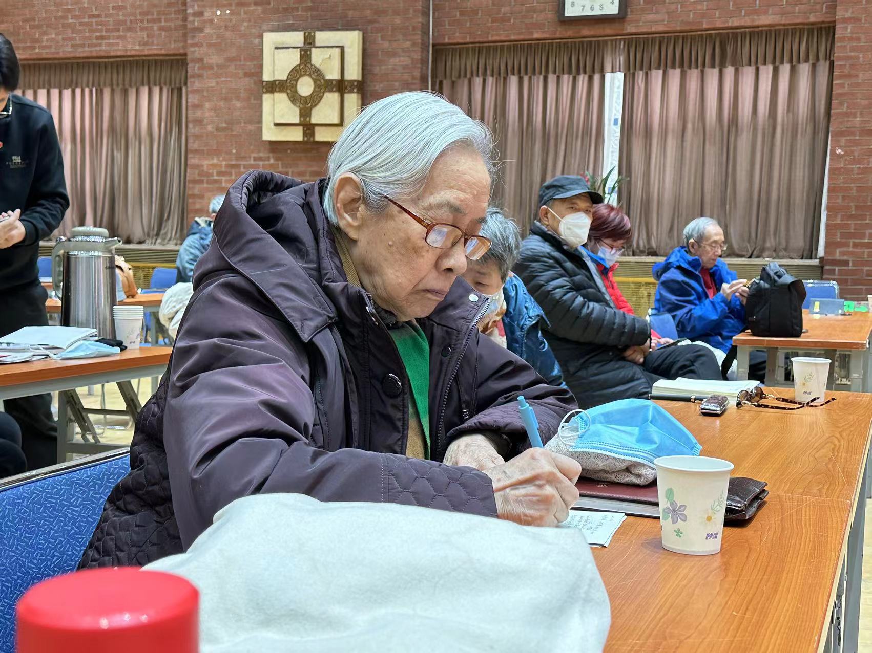 老同志们纷纷掏出了笔记本,时而低下头,一笔一划认真地记下学习心得,时而抬起头,目光炯炯有神,全神贯注地收听培训报告。