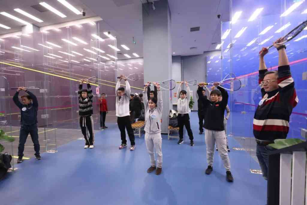 在壁球馆热身和体验壁球