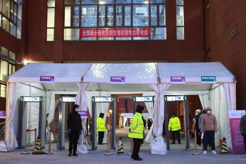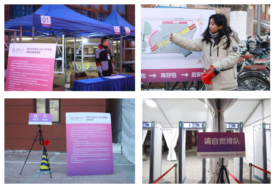 为了让每位考生都能在考试当天有序完成安检,学校细化存包、安检提醒和指南,精心制作详细的存包及安检流程视频,考前通过清华研招网、微信公众号等发布公告,一对一给考生发送短信,让考生提前熟悉考场位置、入校入场时间和路线安排、安全检查等有关要求。在考场周边多处设置路引标识牌,并采取人工引导、现场广播等方式加强指引,确保安检工作能够严格、有序、高效完成。学校在每个安检区都为因身体特殊情况无法使用安检设备的特殊考生专门设置了特殊安检通道,实施一类一策安检流程,并为行动不便的考生及时提供入场协助。考试当天,考生入场流畅,秩序井然。