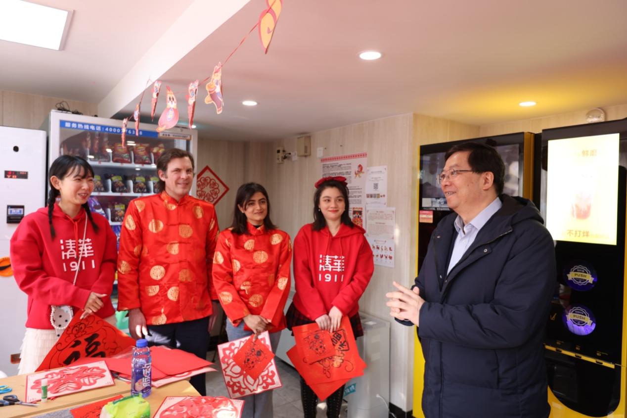 来到学生公寓,喜庆祥和的过年气氛扑面而来。楼道里、宿舍内张贴着对联、福字,悬挂着火红的灯笼和龙年吉祥物装饰品,同学们欢聚一堂,自主设计策划了写对联、做团扇等国潮民俗活动,喜迎新春佳节。在紫荆公寓23号楼和7号楼,邱勇先后看望国际学生和寒假集中住宿的留校学生,详细询问大家的学习和生活情况。“祝同学们春节快乐,龙行龘龘!”邱勇叮嘱同学们节日多与家人联系,并祝愿大家度过一个祥和愉快的春节。