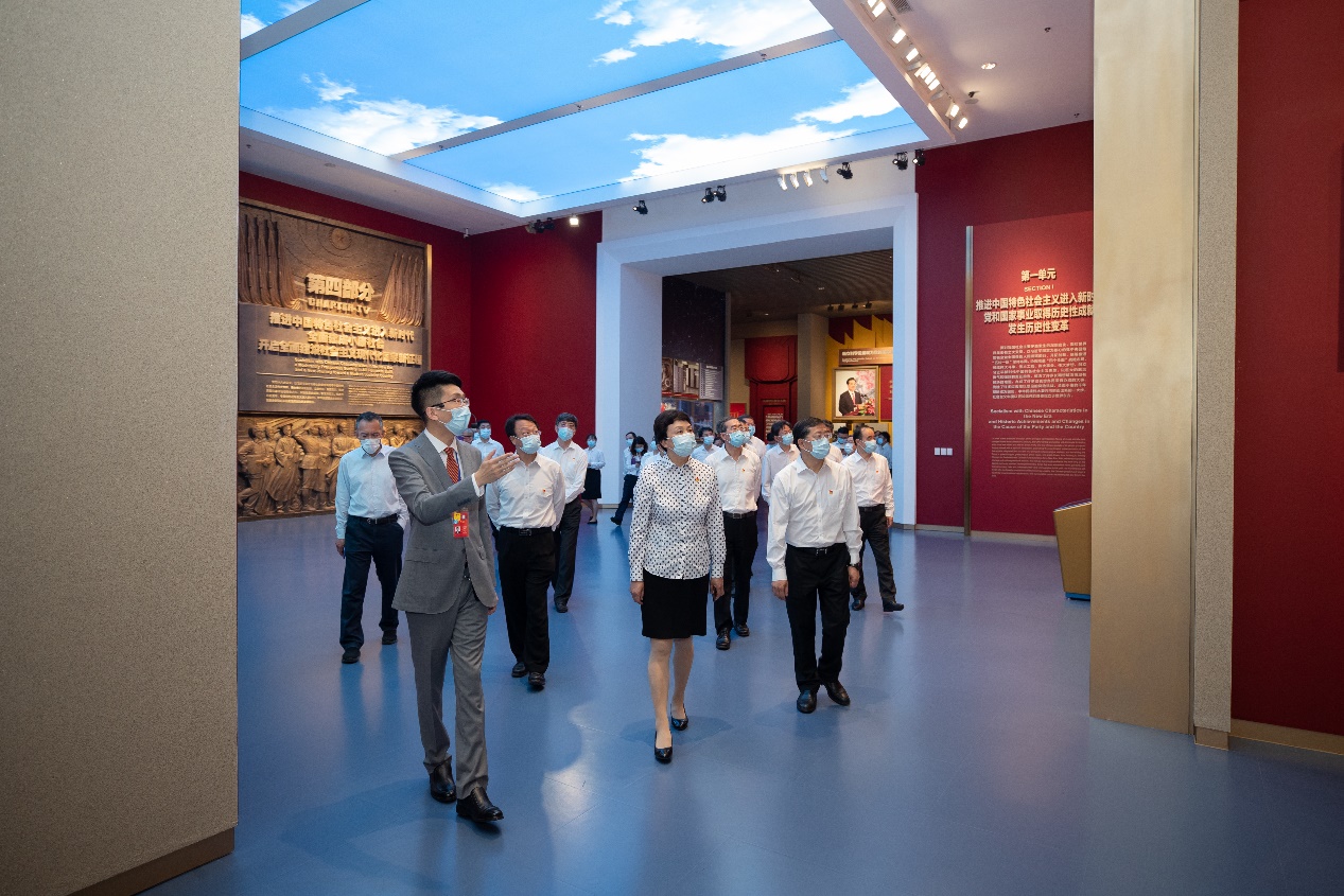 在展馆外广场上,中国共产党历史展览馆党委书记、馆长吴向东向中心组成员介绍了《信仰》《伟业》《攻坚》《追梦》四组大型雕塑的有关情况。步入展厅,中心组成员集体参观了“‘不忘初心、牢记使命’中国共产党历史展览”,一起通过丰富的展陈回顾了中国共产党百年来的不懈奋斗史、不怕牺牲史、理论探索史、为民造福史和自身建设史。