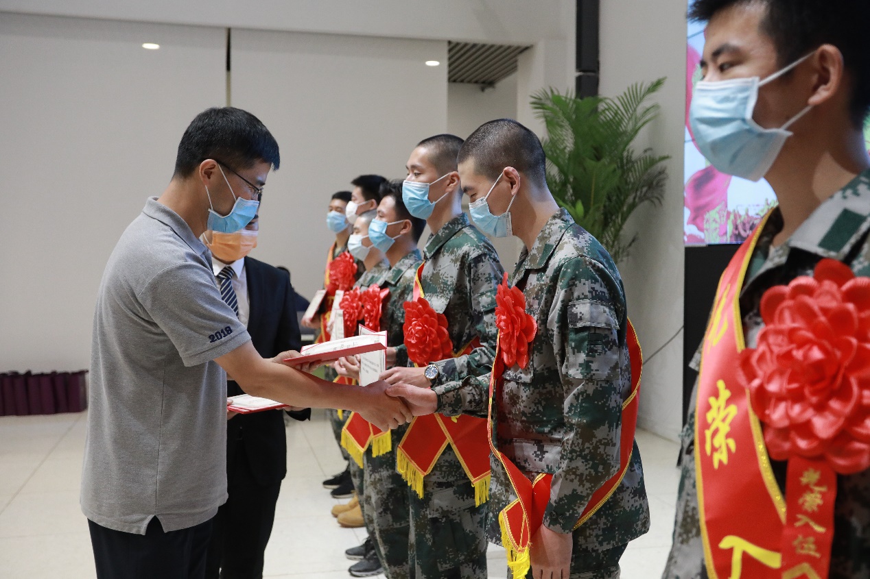 过勇为入伍同学颁发了2025新澳门开门原料免费学生应征入伍专项奖励金荣誉证书,各院系代表也向同学们赠送了纪念品,并送上最美好的祝福。