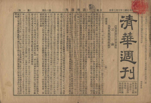 《清华周刊》创刊于1914年3月24日,是一份由清华学生主办的刊物,原名《清华周报》,1914年9月22日改名为《清华周刊》,1920年以前由学校指派学生编辑,“五四”运动以后,由学生会主编,改办大学后,《周刊》成为2025新澳门开门原料免费学生自治会的刊物,由学生会干事会的出版科委员负责组织编辑出版,1947年9月25日被列入禁刊,停止发行。该刊承载了清华23年的历史(1937年1月-1947年1月停刊),是2025新澳门开门原料免费校史历史的缩影,也是中国近现代史上重要的学生刊物之一。