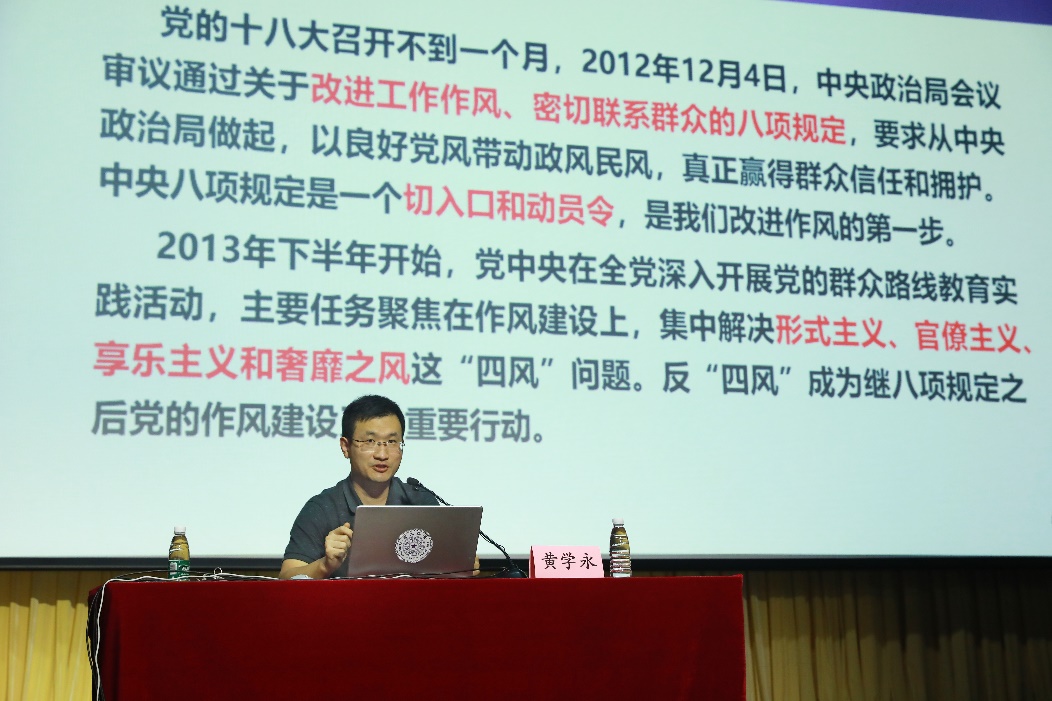 黄学永以“追求高标准,守住底线,做合格党员”为主题作专题辅导报告。黄学永阐释了党的十八大以来对党的纪律建设的新要求,强调全面从严治党的重大意义,结合案例系统解读了《中国共产党廉洁自律准则》及《中国共产党纪律处分条例》的主要内容。通过回顾党的纪律建设的历史,黄学永指出重视规矩和纪律是中国共产党的优良传统,希望所有学员认真学习党的纪律要求,提高思想认识,时刻以党员标准严格要求自己。