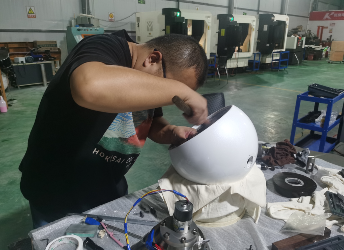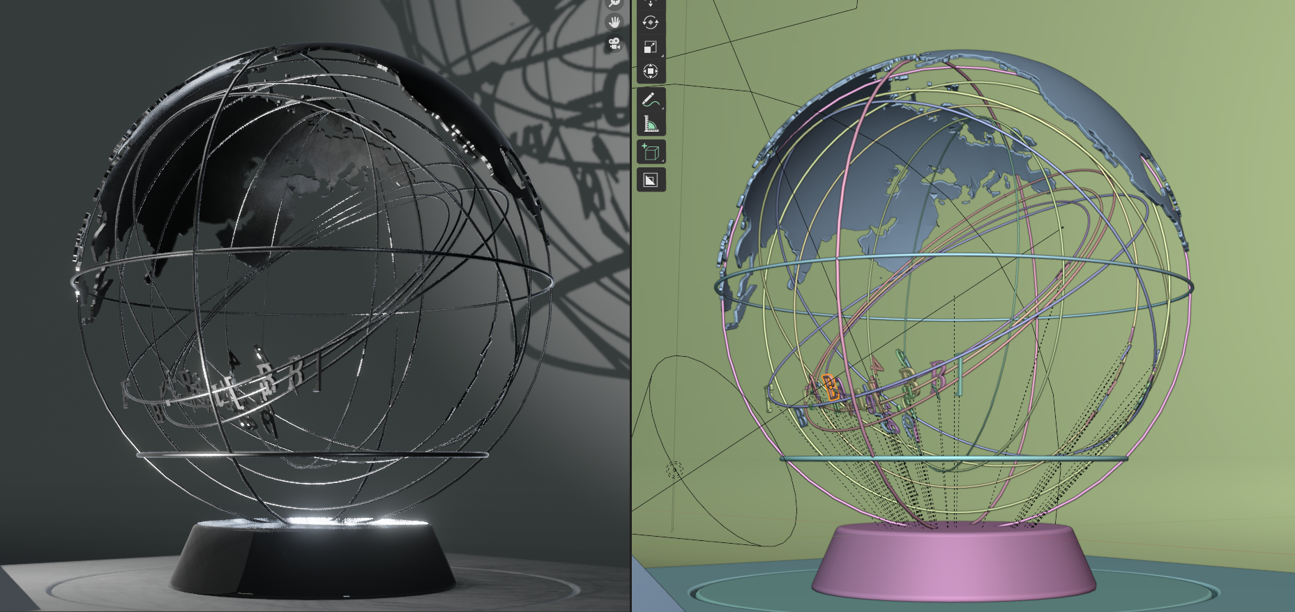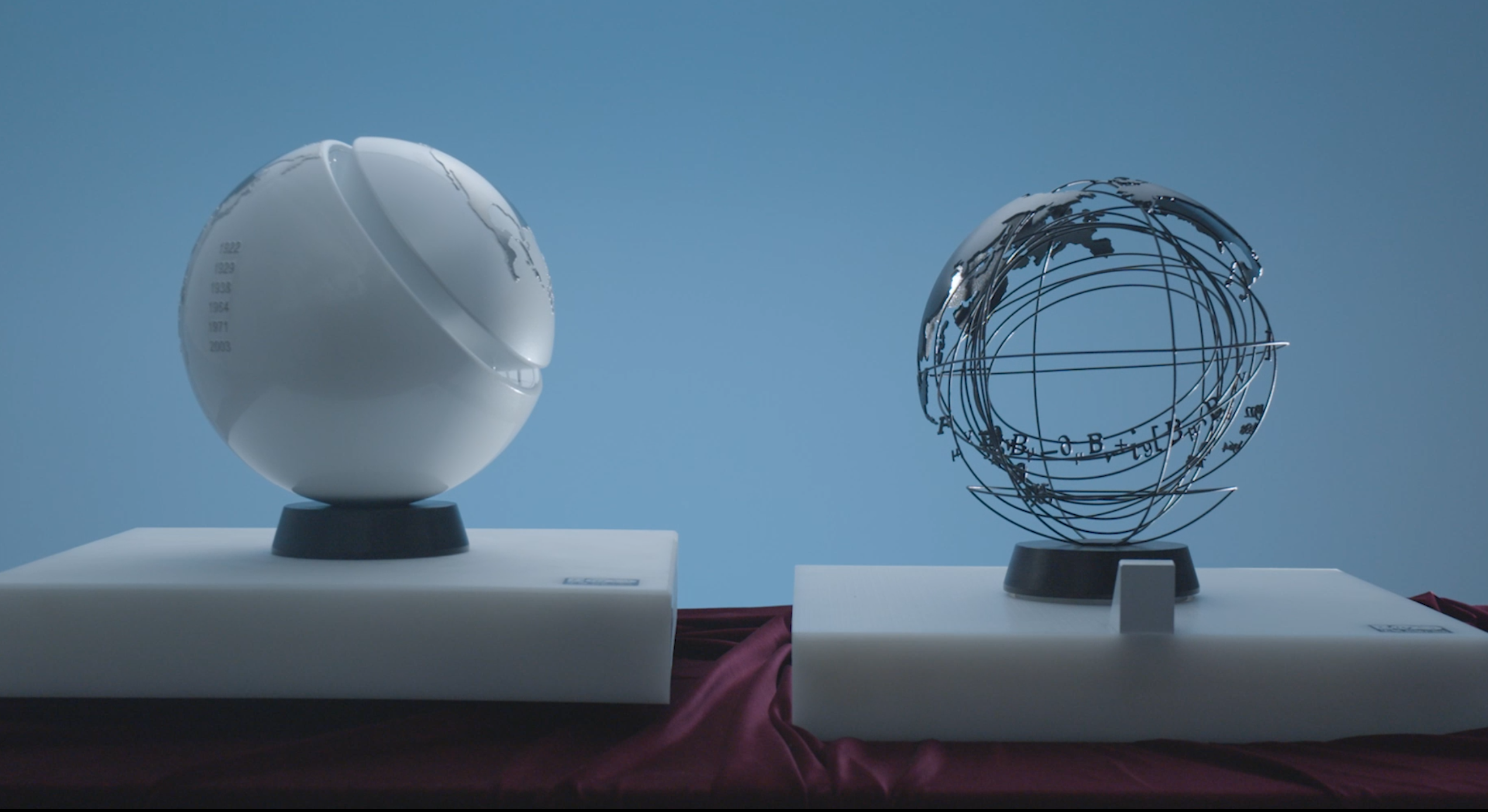 确立了具体元素以后,米海鹏团队和高研院教师多次开会研讨。最终确立由一对设计思路相同,但表现形式不同的作品共同组成的方案。每个作品的主体都是形似“地球”的球体。作品配有投影灯,通过光影效果,两个球体中的重要文字信息被投影显示出来,映射作品虚实相生的意境,延展观者的想象空间。在不打光投影时,这一对作品本身也应该是优美的艺术品。其中之一的主体是镂空经纬线的黑色地球,而另一个的主体是整体金属表面的白色地球。两件作品一黑一白,一虚一实,暗合中国传统文化的阴阳哲学。代表杨振宁先生学术成就的杨-米尔斯方程,只有当地球转动到一个恰当的角度时,才会通过投影的方式呈现在投影墙上。而在没有打开投影的时候,那些公式中的字符则巧妙隐藏在工艺品的不同位置中,给人带来想象的空间。