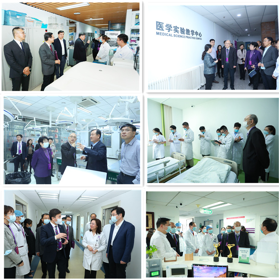 认证专家组参观医学院基础医学实验室、医学院医学实验教学中心、医学院解剖学教学中心、在北京协和医院观摩临床课程教学、走访附属医院北京清华长庚医院、北京华信医院(由左到右,由上到下)