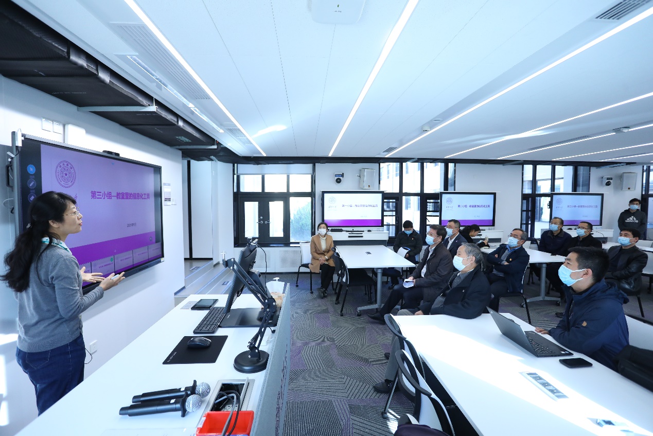 随后,巡回指导组一行来到第三教学楼,参观改造后的教室和公共空间。注册中心主任尹佳、学生社区中心主任方华英、信息化中心副主任佟秋利等向巡回指导组一行介绍了三教改造整体思路。在外观上,原三教外墙上镌刻的“严谨、勤奋、求实、创新”八字学风以及清华革命先驱施滉壁像均保持原貌不变,现场正有党支部在参观学习此处的清华红色风物;在室内装修上,则着力打造多样的公共空间,提升教室的信息化技术水平,使新三教呈现出“开放、灵活、可变”的特点。从三教三段至一段、二段,教学楼里既有学生在大厅设置的自习座位安静学习,也有学习小组利用走廊上配置的多媒体屏幕和白板进行研讨。在阶梯教室,“2021年度求真论坛党史学习教育系列讲座暨唯真讲坛系列理论宣讲”正在进行,现代化装修使教室显得明净宽敞,与生动丰富的理论讲座相得益彰。