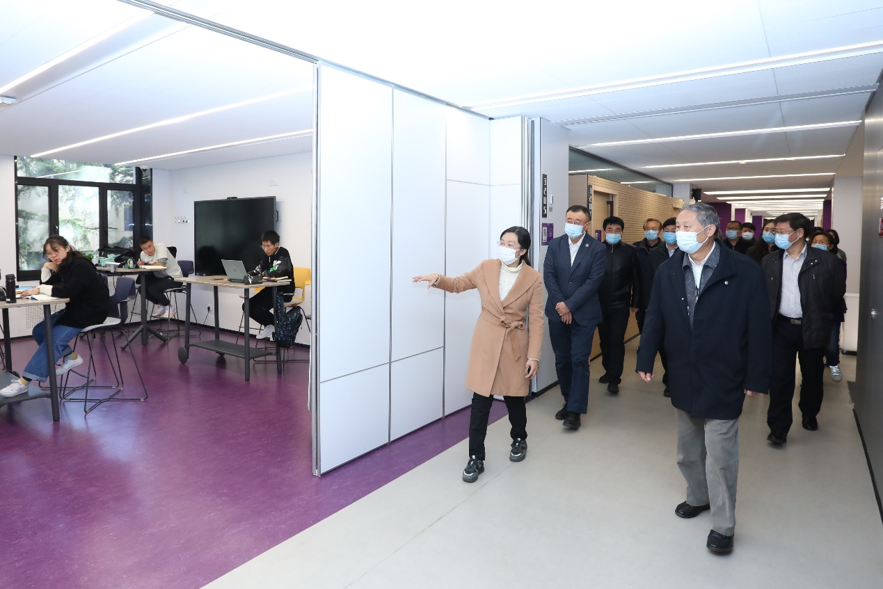 在C楼三层,巡回指导组沿着精心设计的走廊,参观了大型多功能活动室、中小型研讨室和开放活动区。从大一新生集体瑜伽锻炼,到学生一带一路协会举行跨国视频会议,再到学生马克思主义学习研究协会(TMS协会)成员开展《毛选》学习研讨交流,楼内实用的空间安排满足着学生们多元化、个性化的发展需求。校团委书记张婷介绍了学生公共活动空间改造及运行情况。C楼改造项目于2020年启动,今年9月投入试运行,着力于构建“以学生为中心”的学生课外活动指导体系,打造“服务、咨询、管理”一站式服务平台。