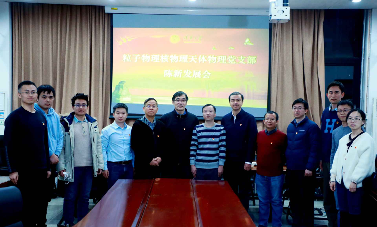 肖志刚代表物理系党委欢迎陈新加入党组织,希望他在今后的工作中坚持服务国家,瞄准关键技术,发挥党员带头作用,提升清华在高能物理实验领域的学术影响力。