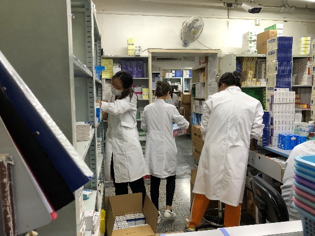 校医院队员在药房拆药上架