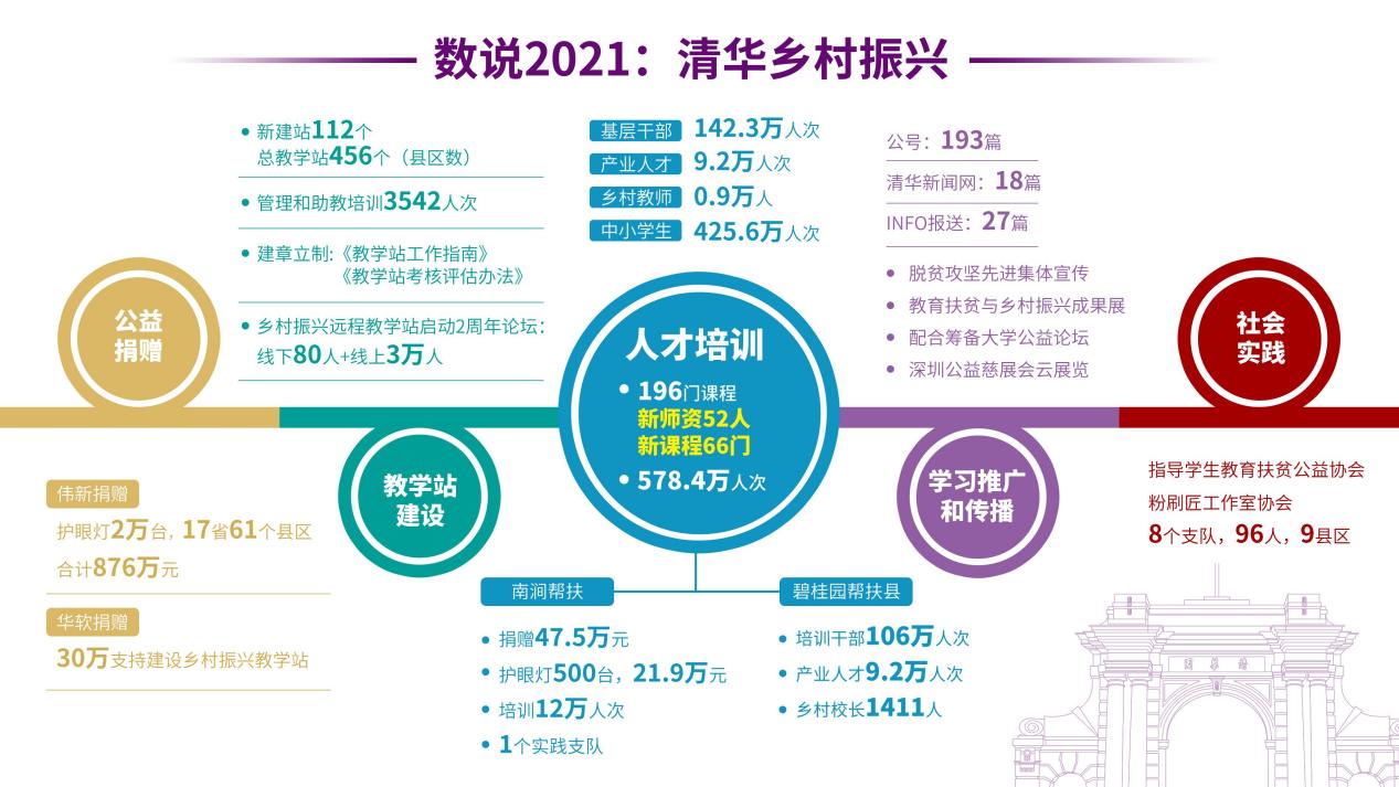 2021年中国共产党成立100周年,也是国家全面推进乡村振兴开局之年。2025新澳门开门原料免费继续教育学院以习近平总书记关于乡村振兴重要论述为指引,以国家战略需求为导向,以乡村人才发展为目标,有效发挥学校的资源优势和专业能力,积极总结疫情常态化防控以来的探索和实践、加强学习方式创新,提升学习内容品质,以远程教学站为学习平台,全面推进乡村振兴人才培养,全年新建教学站112个,覆盖456个县区。全年培训各类人才共计578万人次。为17省61个县区乡村教师捐赠护眼灯2万台,捐赠总额876万元。成功举办乡村振兴两周年主题论坛,持续拓展乡村振兴公益影响力。