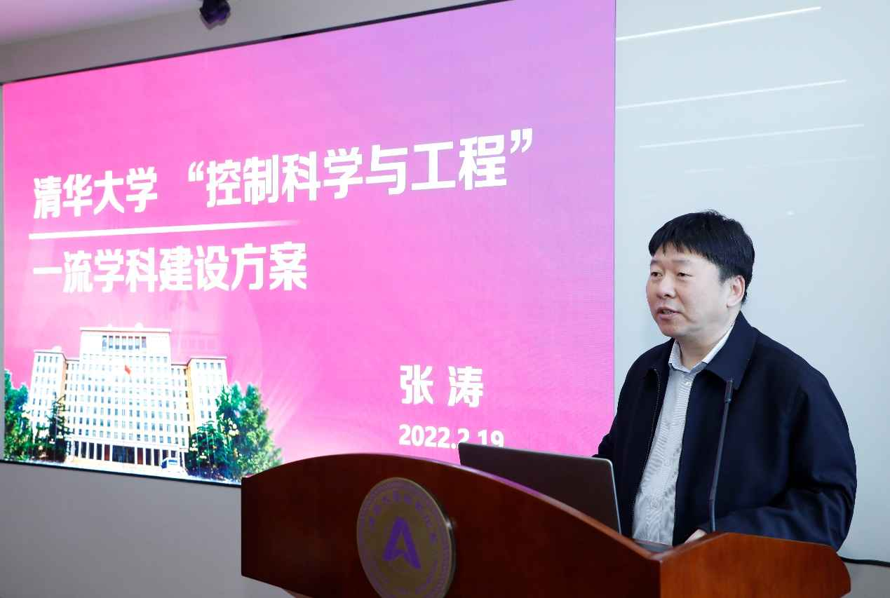 自动化系主任张涛作“一流学科建设方案”的报告。他从学科现状、优势特色、重大成就、国际影响、机遇挑战五个方面详细介绍了控制科学与工程学科的建设与发展情况。随后,他介绍了自动化系“十四五”学科发展规划目标、2030中长期发展目标和主要举措,并对学科发展态势与预期成效进行了分析。