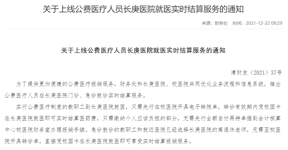 在校内,联合信息化技术中心开发上线网费校内转款功能,实现网费公对公统一结算,坐在办公室内动动指尖,轻松完成网费充值与报销;牵头协同校医院、长庚医院,开发公费医疗实时结算平台,转诊看病时,医药费能时时报销……