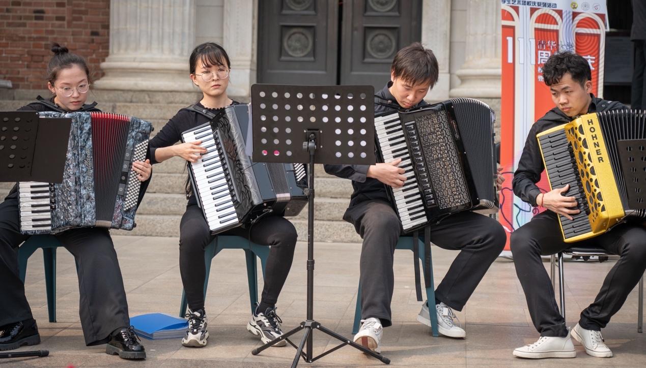 学生键盘队在大礼堂前进行手风琴演出